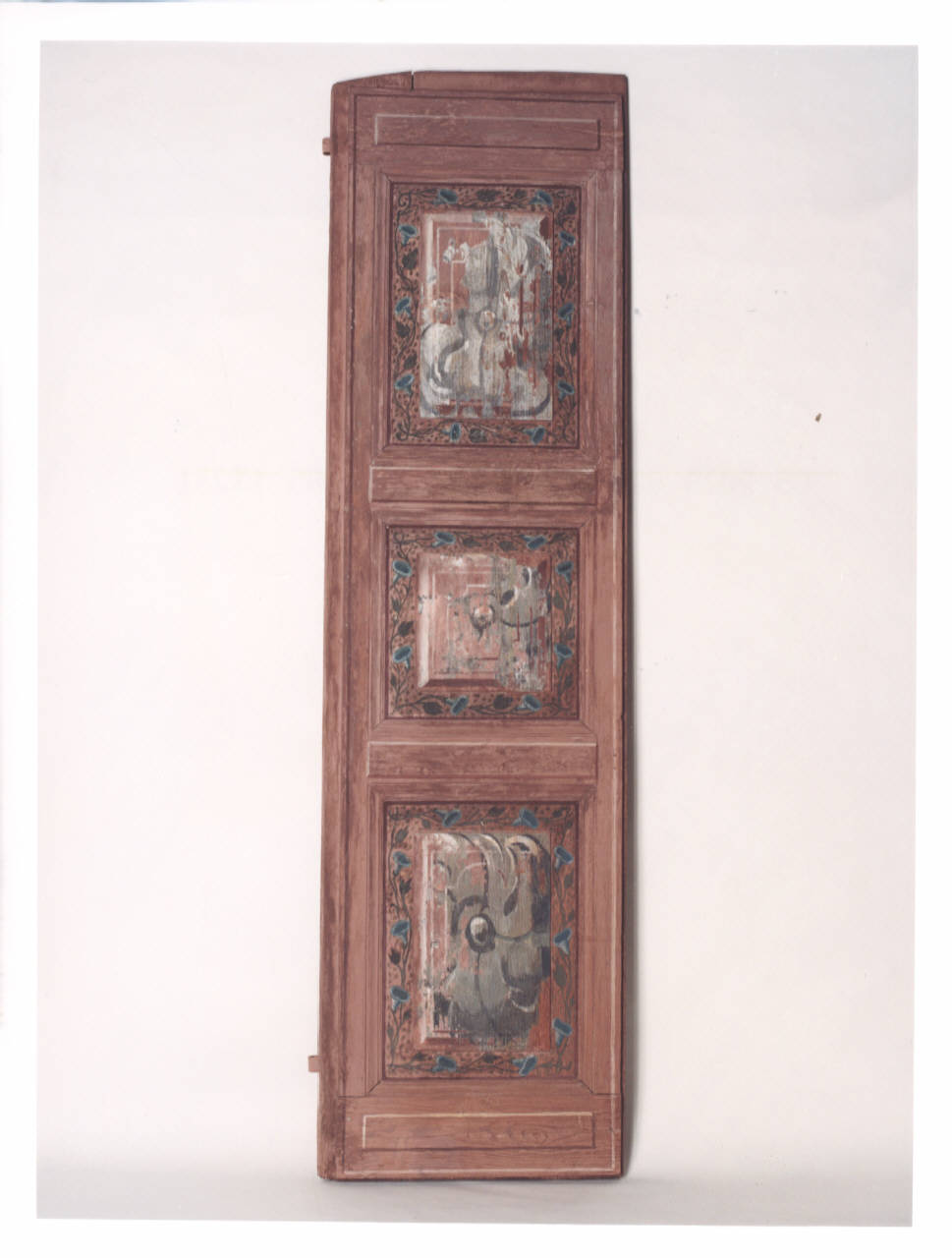 Scuri in legno dipinti a tempera rosa con decoro floreale.