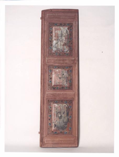 - NOTIZIE STORICO CRITICHE La finestra presenta degli scuri divisi in tre riquadri. La decorazione, a tempera rosa stesa direttamente sul legno, si imposta attorno alla parte centrale. I riquadri mostrano delle tracce di decorazione precedente, forse del secolo XVII, di colore grigio con profilature nere, costituenti dei grossi fiori.