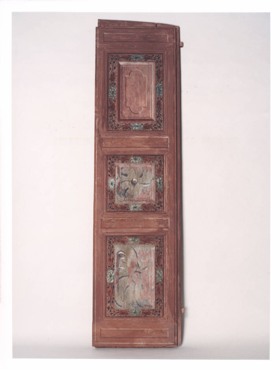 Scuri in legno dipinti a tempera rosa con decoro floreale.