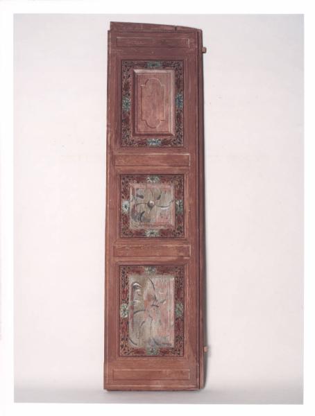 - NOTIZIE STORICO CRITICHE La finestra è corredata da scuri divisi in tre riquadri. La decorazione, a tempera rosa stesa direttamente sul legno, è impostata attorno alla parte centrale con un serto di foglie verdi e dei grossi fiori bianchi, di solito uno per lato. Le specchiature rivelano tracce di decorazione precedente, forse del secolo XVII, di colore grigio con profilature nere, sempre a motivo floreale. Col recente restauro si è evidenziato come la puntinatura visibile intorno ai decori fiorati fosse successiva. Tale sfondo, eseguito ad imitazione dell'oro, era costituito da un impasto di polveri metalliche alteratosi nel tempo, perdendo così l'originaria funzione di arricchimento estetico del disegno. L'inquadratura è data da una cornice architettonica illusionistica, con due accentuate volute laterali e un mazzo di fiori con tulipani, rose e peonie nella parte centrale. Il serto verde è posto nella parte bassa.