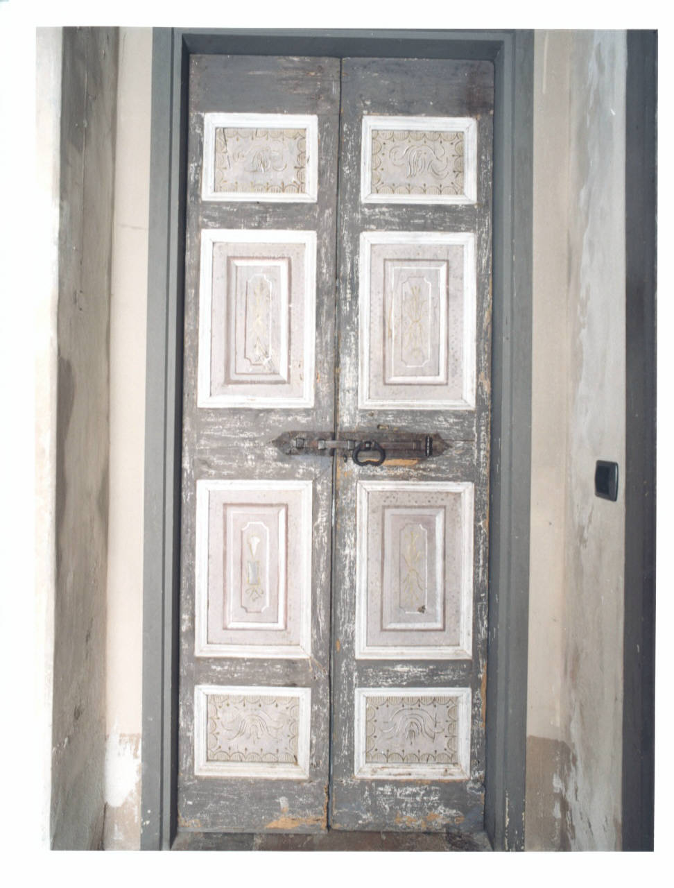 Portoncino in legno dipinto a tempera grigia. I riquadri sono decorati con una cromia più chiara e leggeri motivi geometrici in marrone.