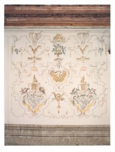 - NOTIZIE STORICO CRITICHE L'alcova presenta una raffinata decorazione a grottesca, in parte ridipinta, che riprende il linguaggio di Filippo Minei, già esplicato nella corte sabauda, ad esempio nel Castello di Rivoli, con il tema della grottesca romana e rinascimentale mescolata al gusto per le cineserie. Con queste caratteristiche è possibile datare la decorazione tra il quarto/quinto decennio del Settecento.