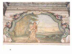 - NOTIZIE STORICO CRITICHE Il fregio si caratterizza per quattro episodi evangelici alternati ad elementi quadraturistici. Scelta piuttosto singolare sia per la collocazione degli stessi in un ambiente laico sia per l'ambientazione in un quadro campestre e boschivo che ben si adatta al fare bozzettistico, e che si può spiegare come un tentativo di ricondurre gli episodi del Nuovo Testamento a una sensibilità molto umana. Privati infatti della loro carica profetica, si riducono a gradevoli ed edificanti digressioni bucoliche citabili quali exempla nelle conversazioni salottiere. Questi affreschi rivelano contatti con la pittura di Pietro Maggi per il suo "fare dolce". Le quadrature, dallo schema solenne e raggelato, caratterizzate da balaustre e vari elementi architettonici arricchiti da vasi con mazzi di fiori, sono molto vicine alle opere dei consueti collaboratori del Bellotti, i Marliani. Queste caratteristiche farebbero quindi propendere per una datazione attorno al quinto decennio del Settecento.