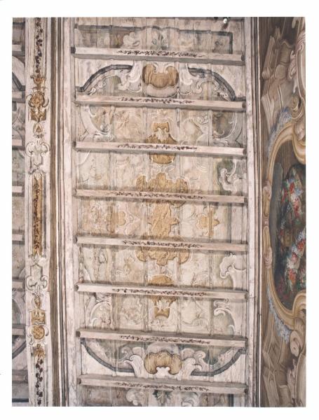 - NOTIZIE STORICO CRITICHE Soffitto ligneo con decoro tardo secentesco caratterizzato da specchiature formate da cornici curvilinee e la presenza di motivi decorativi a conchiglia. La cromia è particolarmente chiara e delicata, con una prevalenza di toni del rosa, del grigio e del giallo che si staglia su fondi chiari e in parte dorati. Particolarmente gradevoli i leggeri decori floreali che si dispongono sulle travi lignee poste in senso orizzontale.
