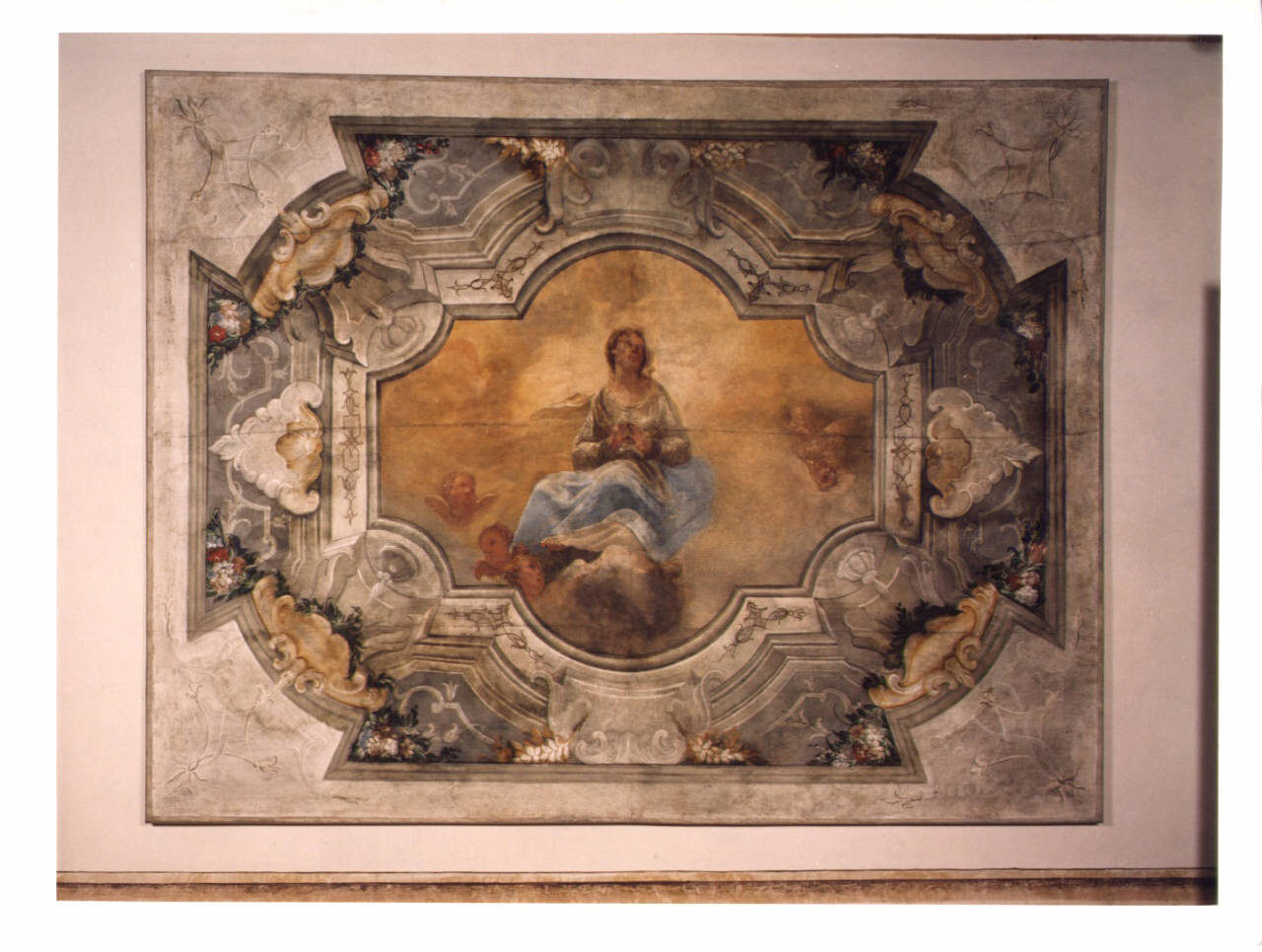 - NOTIZIE STORICO CRITICHE Il dipinto era posto, in origine, sul soffitto dell'alcova posta in fondo alla Galleria. Nella bibliografia viene segnalata come Allegoria della Fede, ma in realtà mancano tutti gli attributi caratteristici per ritenerla tale. Dall'iconografia si deduce che la rappresentazione raffiguri l'Assunzione della Madonna sia per la presenza di nubi su cui è seduta sia per le teste di angeli che la circondano. Anche i colori della veste e del manto sono tipici della Vergine. La composizione si staglia su un fondale luminoso, dato da un intenso color giallo, simbolo caratteristico della luce divina. Attorno si dispiega una bellissima cornice curvilinea con i caratteristici motivi a conchiglia, sottili cornici geometriche, mazzi varipinti di fiori e foglie, con una prevalenza di toni e sfumature grigie su cui spiccano i colori più chiari. Ai quattro angoli su un fondo chiaro troviamo sottili decori con cornici intrecciate nella stessa cromia del fondo. E' probabile che anche quest'opera si inserisca all'interno degli interventi pittorici che vedono attivi in questo periodo nella Villa i Bellotti con una serie di aiuti.