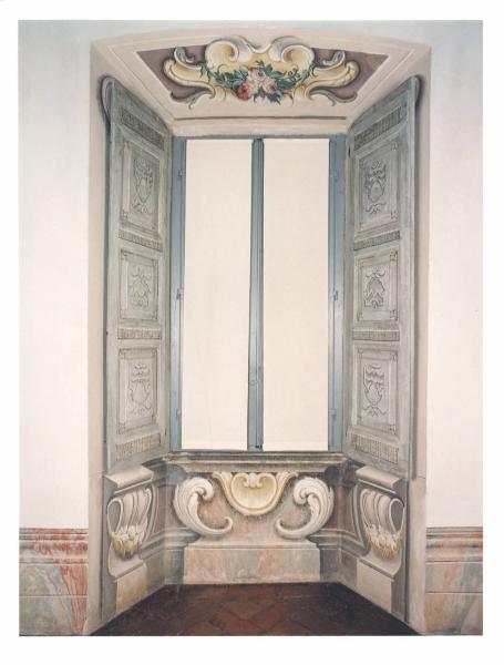 - NOTIZIE STORICO CRITICHE La finestra è decorata con la consueta finta mensola retta da un basamento architettonico, illusionistico, dalle evidenti volute e dal decoro centrale a conchiglia. Nei due basamenti laterali un serto di frutti e foglie. Nella parte superiore , nel ricorrente motivo a conchiglia, troviamo un piccolo mazzo di rose poste nel mezzo di un festone a foglie verdi.