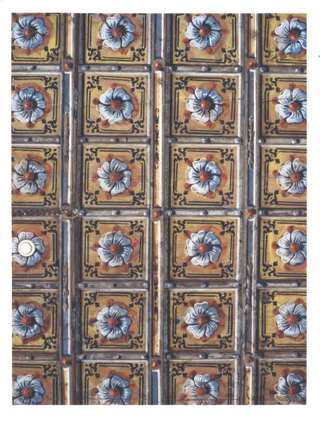 Soffitto a passasotto dipinto a tempera con motivo a lacunari.