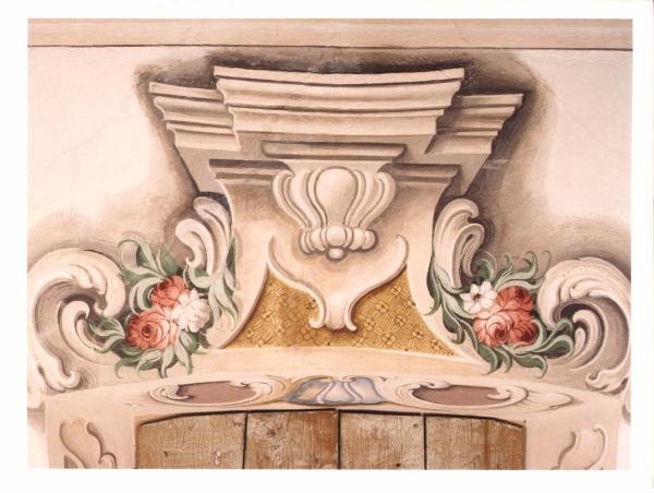 - NOTIZIE STORICO CRITICHE La decorazione è composta da una mensola centrale con due volute aricciolo poste lateralmente e arricchite da due piccoli mazzi di fiori e da foglie verdi.