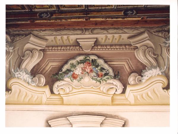 - NOTIZIE STORICO CRITICHE Appena sotto il soffitto ligneo corre un fregio continuo caratterizzato in alto da una cornice fogliacea, in basso da una struttura architettonica i cui angoli sono sottolineati da illusionistiche mensole a forte aggetto, ai cui piedi vi sono delle foglie a monocromo. Al centro di ogni lato si imposta una conchiglia decorata con un festone di fiori, dai colori vivaci e squillanti.