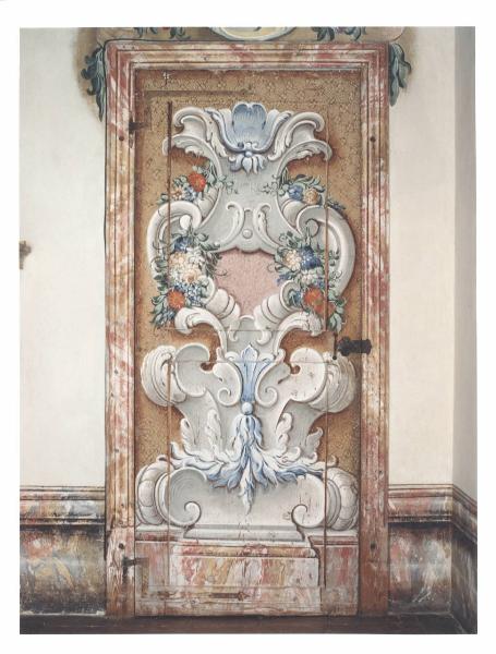 - NOTIZIE STORICO CRITICHE La porta d'ingresso al salone è decorata sia sul recto che sul verso. Nella parte del recto compare, su un fondo giallo variegato da una sottile decorazione a tondi sul marrone, il consueto elemento architettonico costituito da un basamento con volute, in questo caso piuttosto accentuate, e dai classici mazzi di fiori policromi che alleggeriscono la struttura. In alto coronamento a conchiglia nei toni dell'azzurro. Il verso, mostra la stessa tipologia, ma trattata a monocromo e terminante con un vaso da cui fuoriescono dei frutti. Il fondo è diverso nel decoro, qui con sottili racemi, pallini e reticoli. Si ritiene possa essere attribuita alla equipe del Romagnoli, attivo nella decorazione del fregio soprastante.