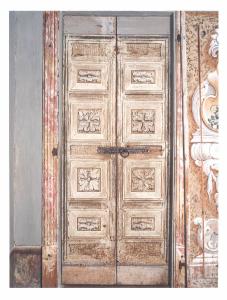 Porta lignea a due battenti dipinta a tempera.