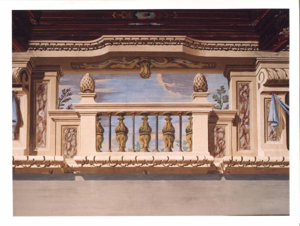 - NOTIZIE STORICO CRITICHE La camera del letto rosso si caratterizza per un fregio che corre per tutte e quattro le pareti. Si compone di quadrature con medaglioni, scorci di paesaggio ed elaborate acquerecce (recipienti metallici ad un manico) barocche ad anse anguiformi e messe uteriormente in evidenza dall'intenso colore giallo. A causa delle gravi infiltrazioni d'acqua, questi decori vennerro ritoccati tra la fine dell'Ottocento e gli inizi del secolo successivo.