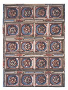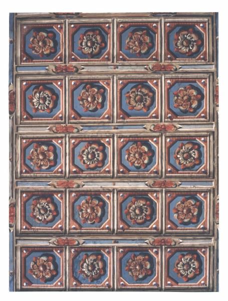 Soffitto ligneo a cassettoni formato da rosoncini dipinti.