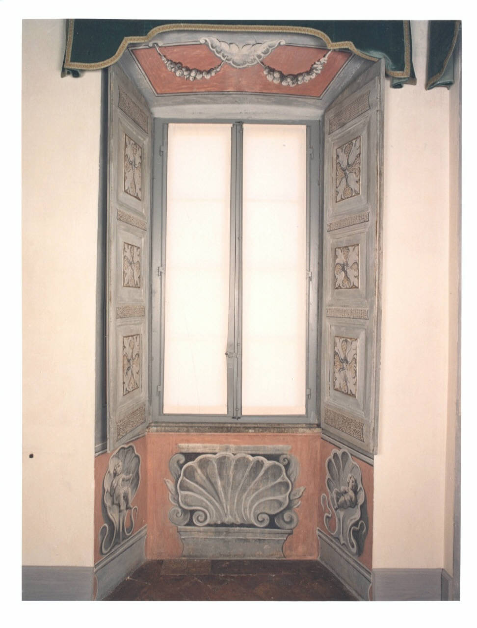 - NOTIZIE STORICO CRITICHE La finestra strombata presenta un decoro a conchiglia nella parte inferiore, ripreso anche nei due lati, ma qui arricchito da due putti. Nella parte superiore è presente il tema del festone con frutti che pende da un'latra conchiglia posta centralmente.