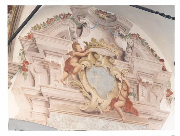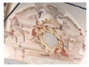 - NOTIZIE STORICO CRITICHE Il cortile d'onore si affaccia sul alto occidentale dell'antico edificio cinquecentesco. Le finestre sono decorate da finti timpani mistilinei sorretti da mensole a ricciolo e decorati con i caratteristici motivi, quali la conchiglia, vasi di fiori e festoni. La finta struttura architettonica che inquadra la porta d'ingresso al salone da ballo presenta, inoltre, lo stemma dei Della Porta sorretto da due putti. AI lati della finestra vi sono delle illusionistiche colonnine scanalate rette da alti basamenti. L'accuratezza dei dettagli, i colori usati e la freschezza della composizione fanno pensare che anche in questa zona della Villa fu attivo con la sua bottega il pittore varesino Giovan Battista Ronchelli. L'autore fu allievo di Francesco Mancini a Roma, per poi diventarlo del Magatti al suo ritorno in patria. Il suo linguaggio si caratterizza per una oscillazione tra suggestioni barocchette desunte dal Magatti, riconoscibili nella scioltezza dell'assetto compositivo e nella morbidezza di modellato della figura, qua e là interrotte da rigidezze caratteristiche da un fare più pesante e con anticipazioni neoclassiche, riconoscibili soprattutto nelle architetture.