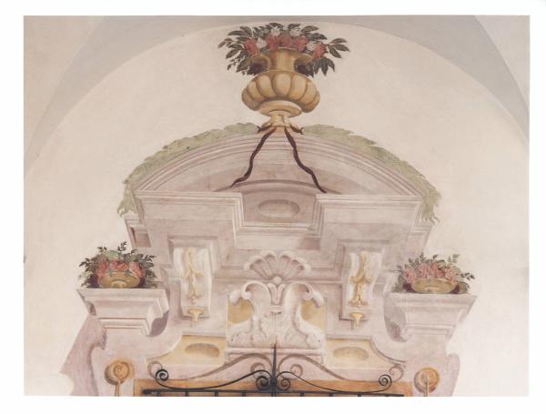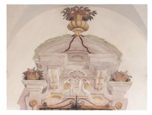 - NOTIZIE STORICO CRITICHE Il cortile d'onore si affaccia sul alto occidentale dell'antico edificio cinquecentesco. Le finestre sono decorate da finti timpani mistilinei sorretti da mensole a ricciolo e decorati con i caratteristici motivi, quali la conchiglia, vasi di fiori e festoni. La finestra, collocata nella parte finale della parete del Salone da ballo, è arricchita, nella parte superiore, da un vaso di fiori, ripreso anche nelle due mensole laterali. L'accuratezza dei dettagli, i colori usati e la freschezza della composizione fanno pensare che anche in questa zona della Villa fu attivo con la sua bottega il pittore varesino Giovan Battista Ronchelli. L'autore fu allievo di Francesco Mancini a Roma, per poi diventarlo del Magatti al suo ritorno in patria. Il suo linguaggio si caratterizza per una oscillazione tra suggestioni barocchette desunte dal Magatti, riconoscibili nella scioltezza dell'assetto compositivo e nella morbidezza di modellato della figura, qua e là interrotte da rigidezze caratteristiche da un fare più pesante e con anticipazioni neoclassiche, riconoscibili soprattutto nelle architetture.