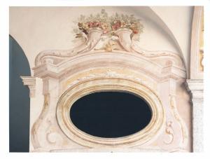 - NOTIZIE STORICO CRITICHE Il cortile d'onore si affaccia sul alto occidentale dell'antico edificio cinquecentesco. Le finestre sono decorate da finti timpani mistilinei sorretti da mensole a ricciolo e decorati con i caratteristici motivi, quali la conchiglia, vasi di fiori e festoni. La decorazione della porta, collocata accanto allo scalone d'onore, presenta il tema della cornucopia con fiori; l'apertura ovale consente, inoltre, di intravedere la delicata decorazione con diverse specie di volatili che ornano il retro dei gradini. L'accuratezza dei dettagli, i colori usati e la freschezza della composizione fanno pensare che anche in questa zona della Villa fu attivo con la sua bottega il pittore varesino Giovan Battista Ronchelli. L'autore fu allievo di Francesco Mancini a Roma, per poi diventarlo del Magatti al suo ritorno in patria. Il suo linguaggio si caratterizza per una oscillazione tra suggestioni barocchette desunte dal Magatti, riconoscibili nella scioltezza dell'assetto compositivo e nella morbidezza di modellato della figura, qua e là interrotte da rigidezze caratteristiche da un fare più pesante e con anticipazioni neoclassiche, riconoscibili soprattutto nelle architetture.