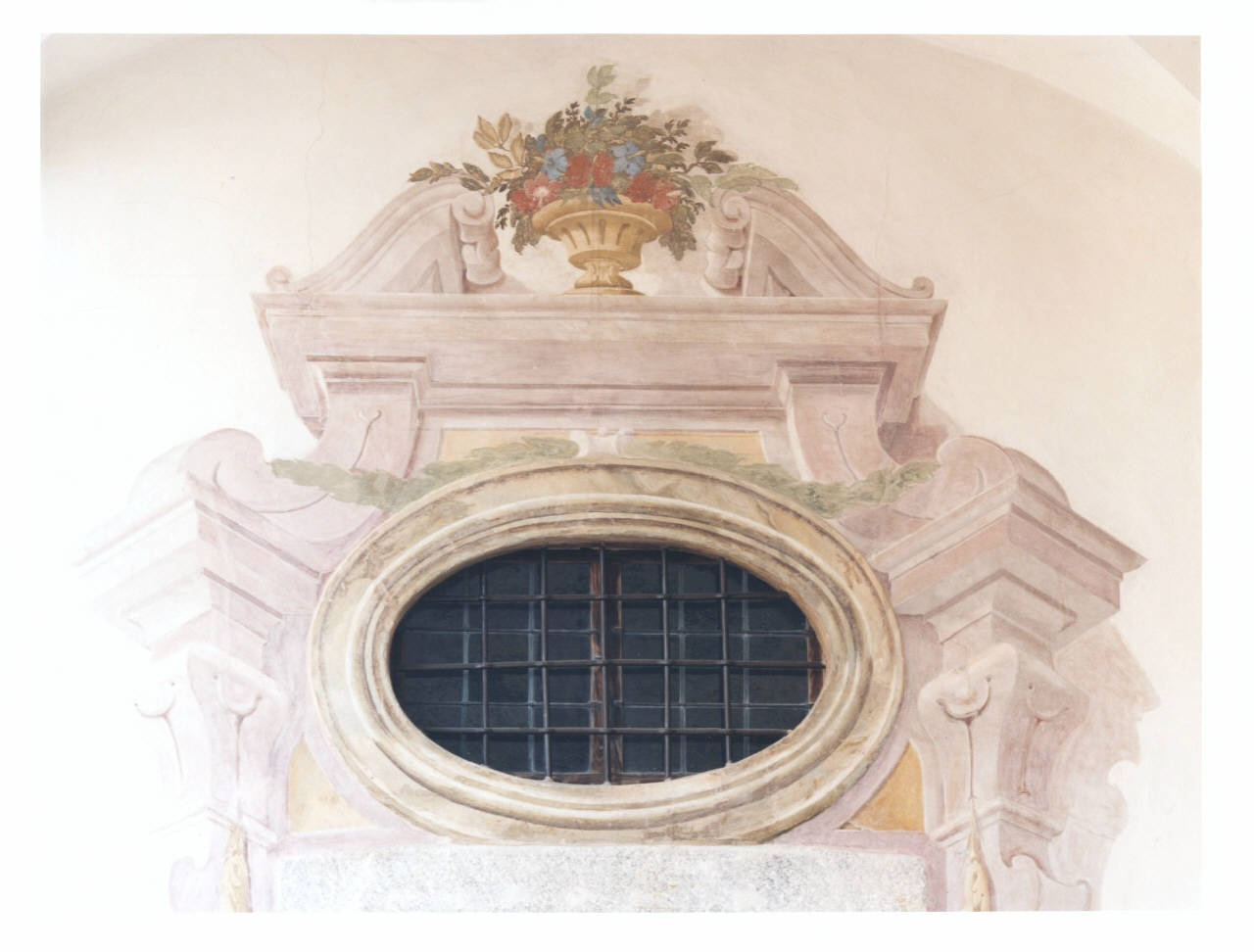 - NOTIZIE STORICO CRITICHE Il cortile d'onore si affaccia sul alto occidentale dell'antico edificio cinquecentesco. La decorazione della porta, collocata sulla parete destra, presenta una struttura architettonica formata da mensole, volute a ricciolo ed un timpano spezzato, nella cui apertura è stato collocato un vaso di fiori. Nella parte sottostante la porta ligna, a due battenti divisi in quattro riquadri ciascuno, è inquadrata da uno cornice a foglie. L'accuratezza dei dettagli, i colori usati e la freschezza della composizione fanno pensare che anche in questa zona della Villa fu attivo con la sua bottega il pittore varesino Giovan Battista Ronchelli. L'autore fu allievo di Francesco Mancini a Roma, per poi diventarlo del Magatti al suo ritorno in patria. Il suo linguaggio si caratterizza per una oscillazione tra suggestioni barocchette desunte dal Magatti, riconoscibili nella scioltezza dell'assetto compositivo e nella morbidezza di modellato della figura, qua e là interrotte da rigidezze caratteristiche da un fare più pesante e con anticipazioni neoclassiche, riconoscibili soprattutto nelle architetture.