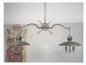 - NOTIZIE STORICO CRITICHE Il lampadario è originario della Villa Della Porta Bozzolo. Sospeso sopra il tavolo da biliardo è formato da un'asta orizzontale a ricciolo. Nella parte terminale, appese ad un sottile gancio, i due portalampade formati da un semplice piatto, mentre il corpo illuminante è protetto da un vestro, sagomato a lucerna. In origine, infatti, il funzionamento doveva essere a petrolio, come testimonia il regolatore dell'intensità della fiamma ancora presente.