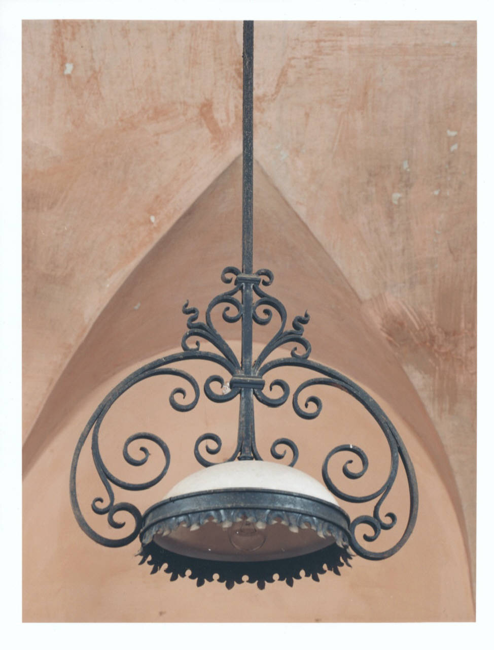 Il lampadario è costituito da un'asta in ferro battuto conclusa, nella parte superiore, da un elemento floreale molto semplice. La zona più ricca è quella inferiore che mostra un'elegante decorazione a ricciolo che sostiene un cerchio arricchito da una sorta di "merletto" sempre in ferro. Il paralume, bianco, è molto semplice ed in porcellana.