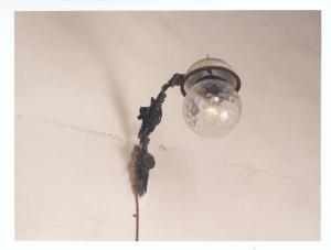 L'asta che sorregge l'applique termina con una semplice calotta bianca, probabilmente in porcellana. Il paralume è costituito da una boccia di vetro trasparente, a bolli, ottenuti con lo scoppio di particelle d'aria, secondo un procedimento prettamente novecentesco.