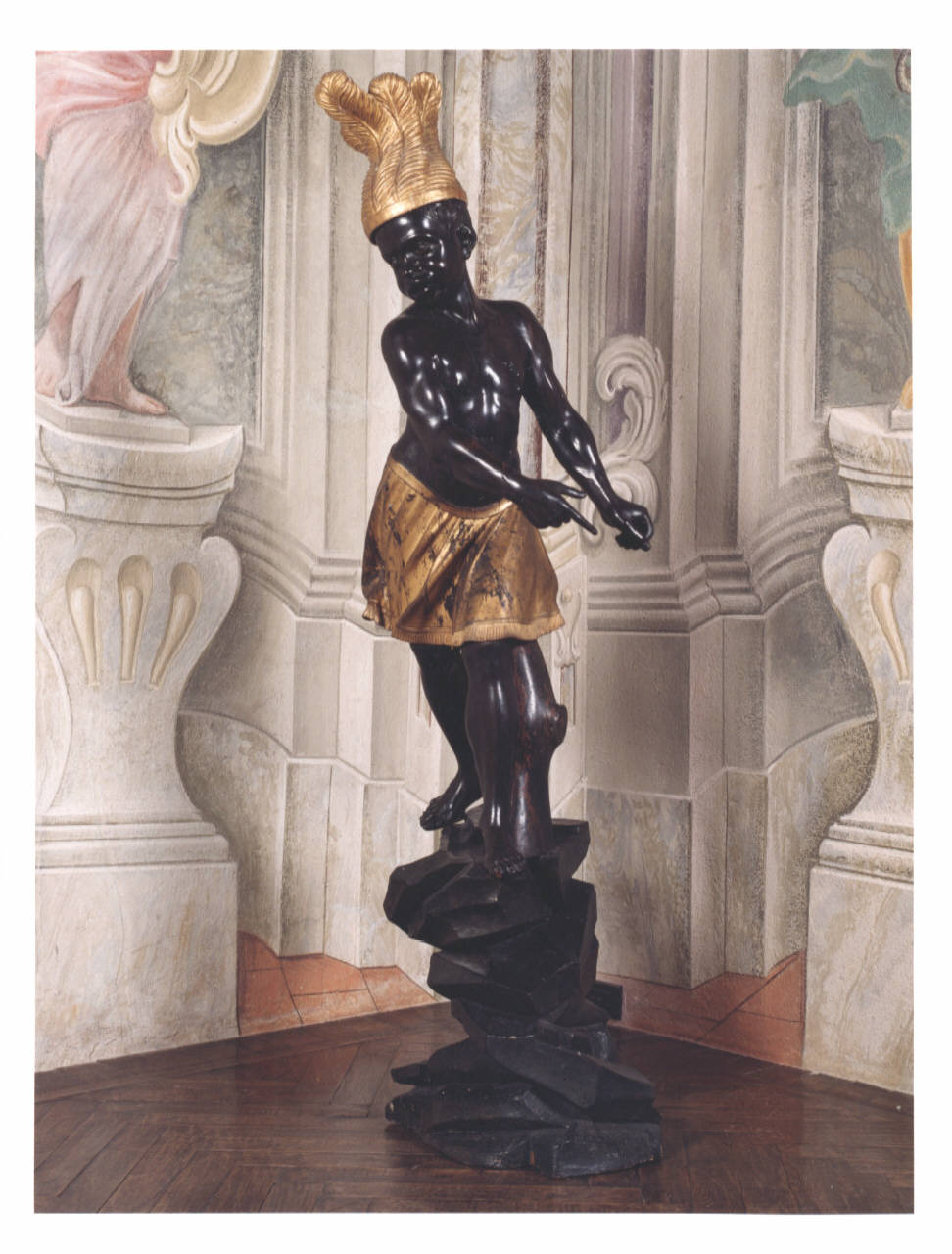 - NOTIZIE STORICO CRITICHE I due moretti sono collocati agli angoli della parete lunga della Galleria della Villa. Poggiano su un basamento in marmo nero. La piccola scultura, in marmo nero lucido, è adornata da un gonnellino dorato, come il copricapo piumato. Dagli inventari redatti nel 1785 e nel 1862 risultano presenti analoghe sculture, in legno, raffiguranti servitori di colore, secondo una moda "esotica", tipica di quel tempo.