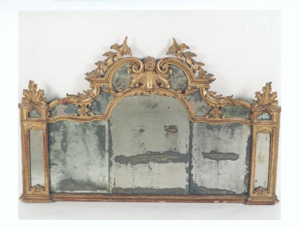 Caminiera con struttura ripartita, sormontata da un intaglio a giorno di fiori, volute, conchiglie, fogliami e fiorellini, lesene rettangolari a specchio
