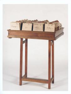 - NOTIZIE STORICO CRITICHE All'interno è conservato un catalogo per autori diviso per scomparti in ordine alfabetico compilato in occasione della schedatura del fondo bibliotecario eseguito da un bibliotecario torinese insieme a Teresa e Carlotta Bozzolo. Il cavalletto non fa parte dello schedario, aggiunto successivamente. In origine lo schedario era collocato infatti sopra la scrivania, come testimonia una foto dello Studio di inizio Novecento.