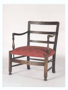 Schienale rettangolare a giorno con traverse, quella superiore traforata al centro con motivi decorativi, braccioli mossi con sostegni torniti a balaustro, sostegni posteriori a sciabola, sostegni anteriori dritti, catena anteriore traforata con motivi decorativi, gambe terminanti a cipolla; seduta rivestita in tessuto operato rosa