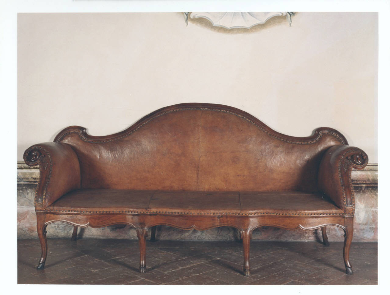 Divano a orecchioni, braccioli rovesciati verso l'esterno terminanti a volute intagliate, schienale e cintura sagomati, gambe mosse con finali a zoccolo di capro; schienale e seduta imbottiti e rivestiti in pelle fissata con borchie