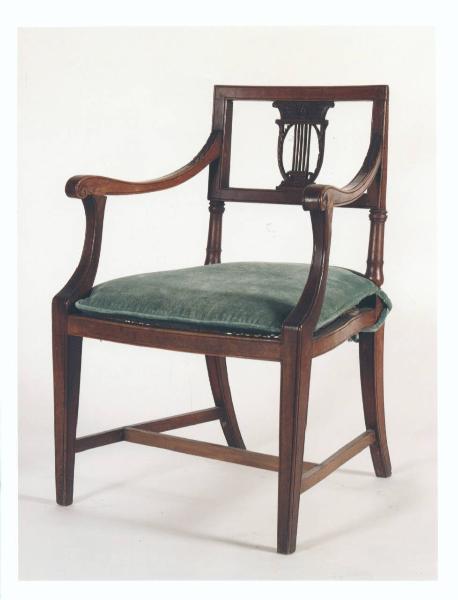 - NOTIZIE STORICO CRITICHE Poltrona neoclassica con il caratteristico motivo decorativo a lira. Insieme alle altre tre sedie con motivo a lira nella stessa stanza, era originariamente collocata nello Studio, come è documentata da una foto dei primi del Novecento.