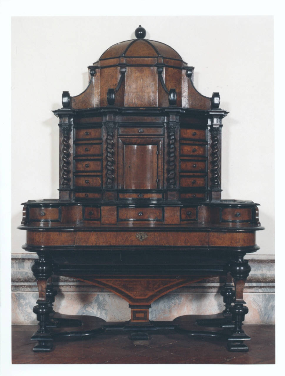 Scrittoio sormontato da un'alzata di forma architettonica terminante con cupola con finale a boccia sorretta da sostegni a volute, fronte con quattro colonne tortili, cinque cassettini sui due lati, al centro due cassetti con in mezzo un'anta bombata; piano sagomato e intarsiato con cinque casetti e fascia a un cassetto, sostegni a balaustro intarsiati raccordati da traversa a "X"