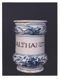 - NOTIZIE STORICO CRITICHE Vaso da farmacia proveniente dalla farmacia Barberis, attiva in Bistagno (Alessandria) dalla prima metà del XIX secolo. L'iscrizione testimonia l'originario contenuto dell'albarello: un unguento (medicamento di consistenza molle). In assenza del marchio della manifattura di produzione non si riesce a determinare se l'oggetto proviene da Savona o Albisola. La produzione dei due centri liguri ebbe infatti inizio con caratteri distinti e separati, ma finì per fondersi in uno stile e in una tecnica pressochè uguali.
