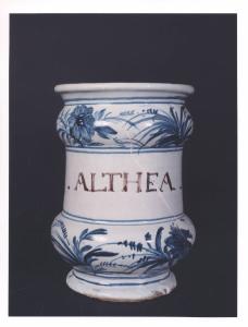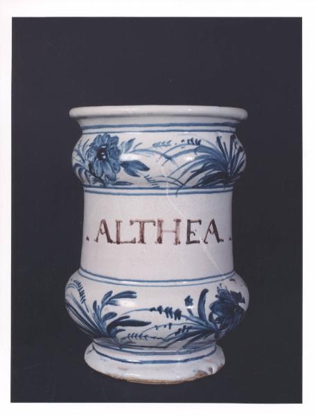 - NOTIZIE STORICO CRITICHE Vaso da farmacia proveniente dalla farmacia Barberis, attiva in Bistagno (Alessandria) dalla prima metà del XIX secolo. L'iscrizione testimonia l'originario contenuto dell'albarello: un unguento (medicamento di consistenza molle) a base di malva (da althaea, ae, f.). In assenza del marchio della manifattura di produzione non si riesce a determinare se l'oggetto proviene da Savona o Albisola. La produzione dei due centri liguri ebbe infatti inizio con caratteri distinti e separati, ma finì per fondersi in uno stile e in una tecnica pressochè uguali.