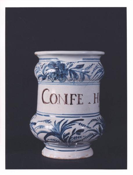 - NOTIZIE STORICO CRITICHE Vaso da farmacia proveniente dalla farmacia Barberis, attiva in Bistagno (Alessandria) dalla prima metà del XIX secolo. L'iscrizione testimonia l'originario contenuto dell'albarello: una confettura (medicamento di consistenza molle). Da notare la presenza di un residuo di etichetta, in parte non leggibile, con la scritta "Sabina" e "Farmacia Barberis di Bistagno (Alessandria)". In assenza del marchio della manifattura di produzione non si riesce a determinare se l'oggetto proviene da Savona o Albisola. La produzione dei due centri liguri ebbe infatti inizio con caratteri distinti e separati, ma finì per fondersi in uno stile e in una tecnica pressochè uguali.