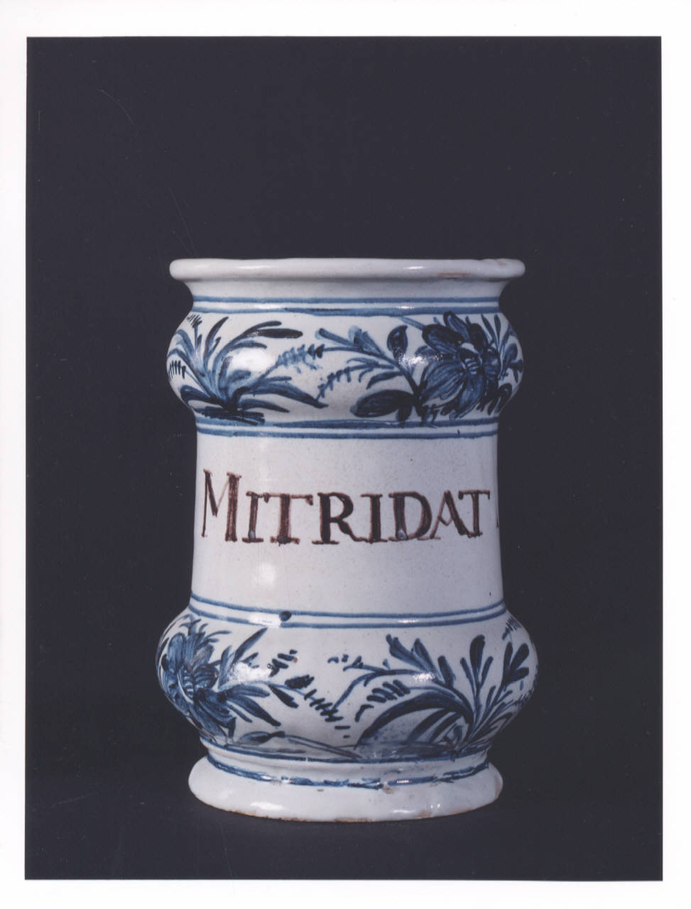 - NOTIZIE STORICO CRITICHE Vaso da farmacia proveniente dalla farmacia Barberis, attiva in Bistagno (Alessandria) dalla prima metà del XIX secolo. L'iscrizione testimonia l'originario contenuto dell'alberello: il Mitridato, un elettuaro (medicamento di consistenza densa). A differenza di altre iscrizioni in cui l'indicazione del farmaco è espressa da due parole (la prima di solito abbreviata indica il tipo di medicamento, la seconda il principale ingrediente terapeutico), l'iscrizione in questione è formata da un'unica parola poichè si tratta di un medicamento molto conosciuto che porta il nome di un personaggio dell'antichità: Mitridate. Era infatti pratica terapeutica plurisecolare riportare sui vasi da farmacia i nomi dei padri della medicina, di personaggi storici, re, condottieri, religiosi\nIn assenza del marchio della manifattura di produzione non si riesce a determinare se l'oggetto proviene da Savona o Albisola. La produzione dei due centri liguri ebbe infatti inizio con caratteri distinti e separati, ma finì per fondersi in uno stile e in una tecnica pressochè uguali.