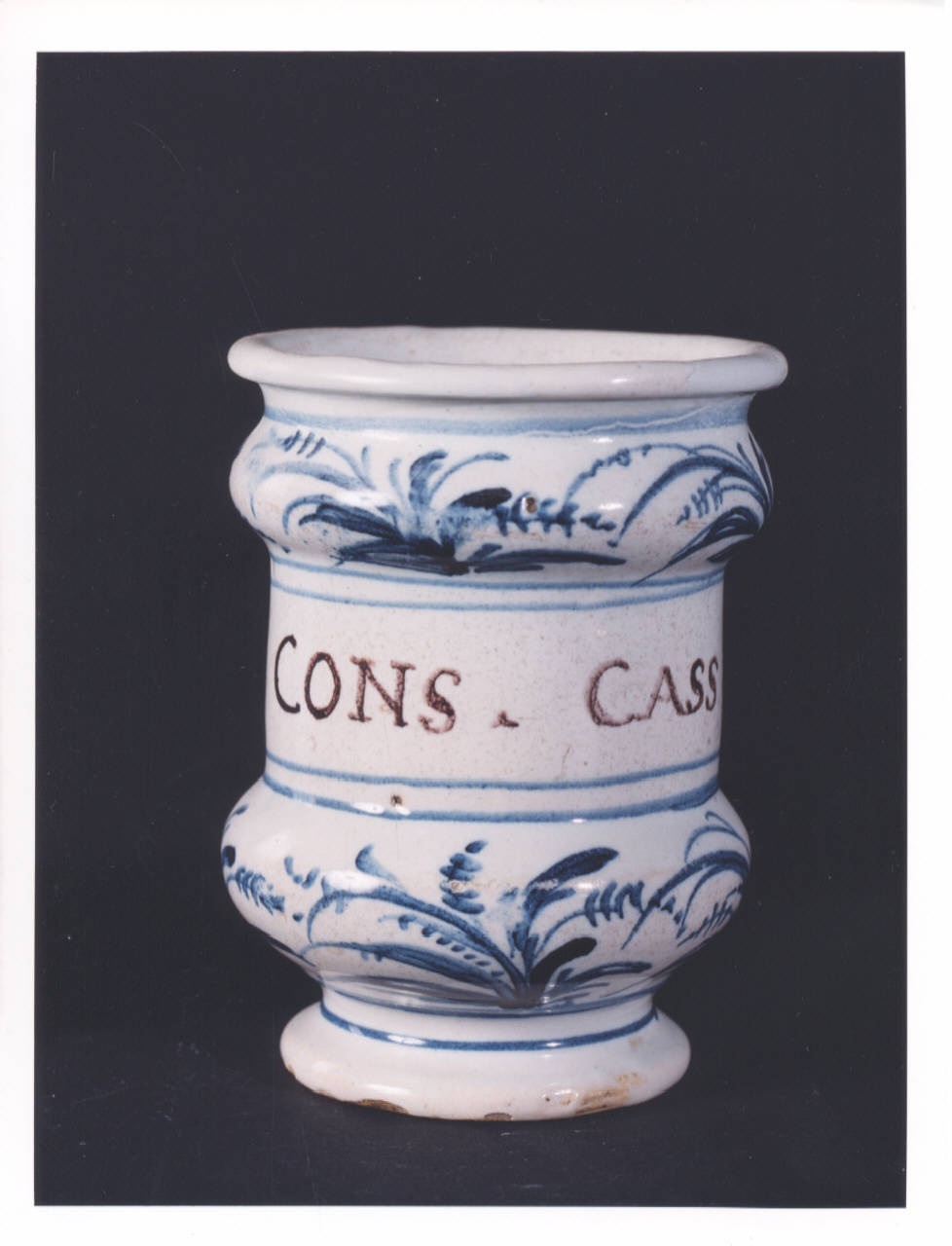 - NOTIZIE STORICO CRITICHE Vaso da farmacia proveniente dalla farmacia Barberis, attiva in Bistagno (Alessandria) dalla prima metà del XIX secolo. L'iscrizione testimonia l'originario contenuto dell'alberello: una conserva (medicamento di consistenza molle). In assenza del marchio della manifattura di produzione non si riesce a determinare se l'oggetto proviene da Savona o Albisola. La produzione dei due centri liguri ebbe infatti inizio con caratteri distinti e separati, ma finì per fondersi in uno stile e in una tecnica pressochè uguali.