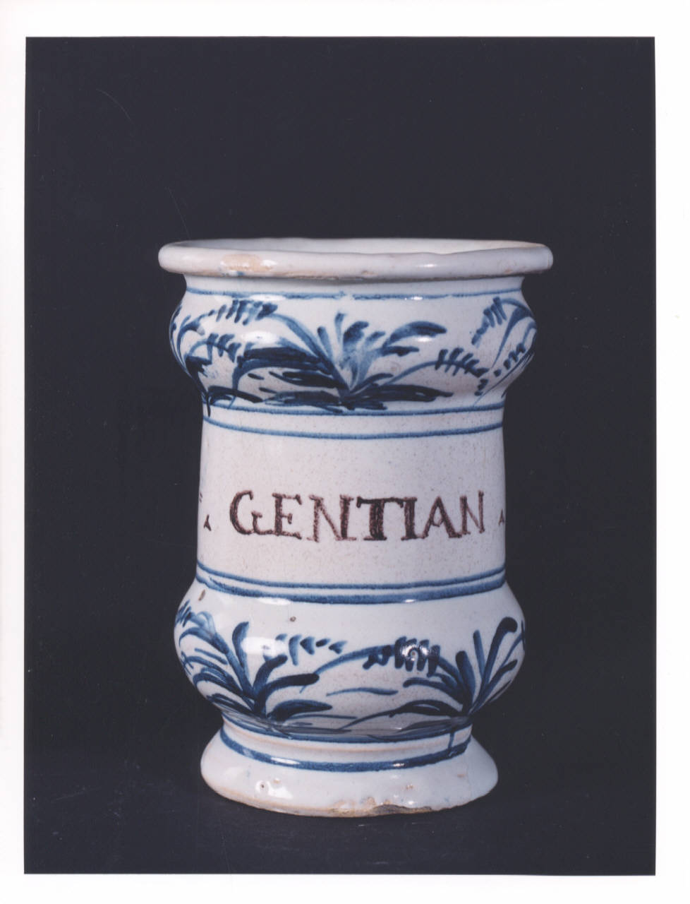 - NOTIZIE STORICO CRITICHE Vaso da farmacia proveniente dalla farmacia Barberis, attiva in Bistagno (Alessandria) dalla prima metà del XIX secolo. L'iscrizione testimonia l'originario contenuto dell'alberello: un estratto (medicamento di consistenza solida) a base di genziana. In assenza del marchio della manifattura di produzione non si riesce a determinare se l'oggetto proviene da Savona o Albisola. La produzione dei due centri liguri ebbe infatti inizio con caratteri distinti e separati, ma finì per fondersi in uno stile e in una tecnica pressochè uguali.
