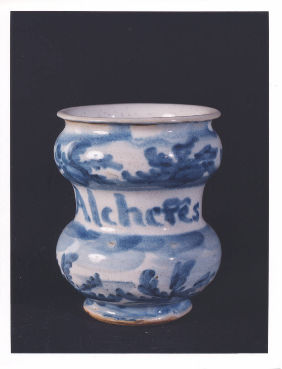 - NOTIZIE STORICO CRITICHE Vaso da farmacia proveniente dalla farmacia Barberis, attiva in Bistagno (Alessandria) dalla prima metà del XIX secolo. L'iscrizione testimonia l'originario contenuto dell'alberello: una confettura (medicamento di consistenza molle). In assenza del marchio della manifattura di produzione non si riesce a determinare se l'oggetto proviene da Savona o Albisola. La produzione dei due centri liguri ebbe infatti inizio con caratteri distinti e separati, ma finì per fondersi in uno stile e in una tecnica pressochè uguali.