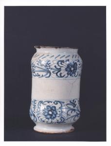 • NOTIZIE STORICO CRITICHE Vaso da farmacia proveniente dalla farmacia Barberis, attiva in Bistagno (Alessandria) dalla prima metà del XIX secolo. La mancanza dell'iscrizione testimonia una destinazione generica dell'albarello, contenitore di sostanze medicamentose non definite. Tipologia decorativa comunemente chiamata floreale (stilizzata). In assenza del marchio della manifattura di produzione non si riesce a determinare se l'oggetto proviene da Savona o Albisola. La produzione dei due centri liguri ebbe infatti inizio con caratteri distinti e separati, ma finì per fondersi in uno stile e in una tecnica pressochè uguali.
