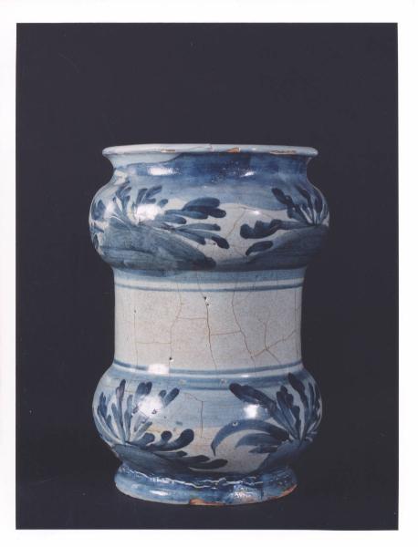 - NOTIZIE STORICO CRITICHE Vaso da farmacia proveniente dalla farmacia Barberis, attiva in Bistagno (Alessandria) dalla prima metà del XIX secolo. La mancanza dell'iscrizione testimonia una destinazione generica dell'albarello, contenitore di sostanze medicamentose non definite. In assenza del marchio della manifattura di produzione non si riesce a determinare se l'oggetto proviene da Savona o Albisola. La produzione dei due centri liguri ebbe infatti inizio con caratteri distinti e separati, ma finì per fondersi in uno stile e in una tecnica pressochè uguali.