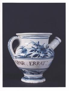 - NOTIZIE STORICO CRITICHE Vaso da farmacia proveniente dalla farmacia Barberis, attiva in Bistagno (Alessandria) dalla prima metà del XIX secolo. L'iscrizione testimonia l'originario contenuto del boccale: uno sciroppo di papaveri. In assenza del marchio della manifattura di produzione non si riesce a determinare se l'oggetto proviene da Savona o Albisola. La produzione dei due centri liguri ebbe infatti inizio con caratteri distinti e separati, ma finì per fondersi in uno stile e in una tecnica pressochè uguali.