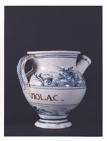 - NOTIZIE STORICO CRITICHE Vaso da farmacia proveniente dalla farmacia Barberis, attiva in Bistagno (Alessandria) dalla prima metà del XIX secolo. L'iscrizione testimonia l'originario contenuto del boccale: uno sciroppo alle viole. In assenza del marchio della manifattura di produzione non si riesce a determinare se l'oggetto proviene da Savona o Albisola. La produzione dei due centri liguri ebbe infatti inizio con caratteri distinti e separati, ma finì per fondersi in uno stile e in una tecnica pressochè uguali.