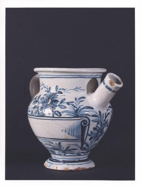 - NOTIZIE STORICO CRITICHE Vaso da farmacia proveniente dalla farmacia Barberis, attiva in Bistagno (Alessandria) dalla prima metà del XIX secolo. La mancanza dell'iscrizione testimonia una destinazione generica del boccale, contenitore di sostanze medicamentose liquide non definite. In assenza del marchio della manifattura di produzione non si riesce a determinare se l'oggetto proviene da Savona o Albisola. La produzione dei due centri liguri ebbe infatti inizio con caratteri distinti e separati, ma finì per fondersi in uno stile e in una tecnica pressochè uguali.