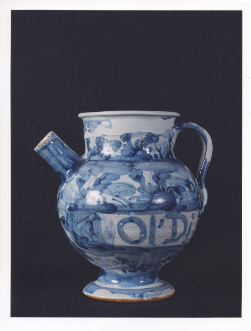 - NOTIZIE STORICO CRITICHE Vaso da farmacia proveniente dalla farmacia Barberis, attiva in Bistagno (Alessandria) dalla prima metà del XIX secolo. L'iscrizione testimonia l'originario contenuto del boccale: olio di euforbio. In assenza del marchio della manifattura di produzione non si riesce a determinare se l'oggetto proviene da Savona o Albisola. La produzione dei due centri liguri ebbe infatti inizio con caratteri distinti e separati, ma finì per fondersi in uno stile e in una tecnica pressochè uguali.