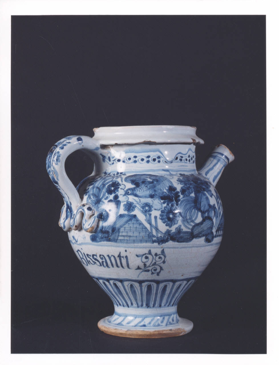 - NOTIZIE STORICO CRITICHE Vaso da farmacia proveniente dalla farmacia Barberis, attiva in Bistagno (Alessandria) dalla prima metà del XIX secolo. L'iscrizione testimonia l'originario contenuto del boccale: sciroppo di Bisanzio. La tipologia decorativa comunemente chiamata a motivi "calligrafico-naturalistico" si diffuse in Europa nel XVII e XVIII secolo; è caratterizzata dalla ripresa dei repertori decorativi (elementi vegetali, animali, uccelli) delle porcellane cinesi del periodo Wan-Li (1573-1619).
