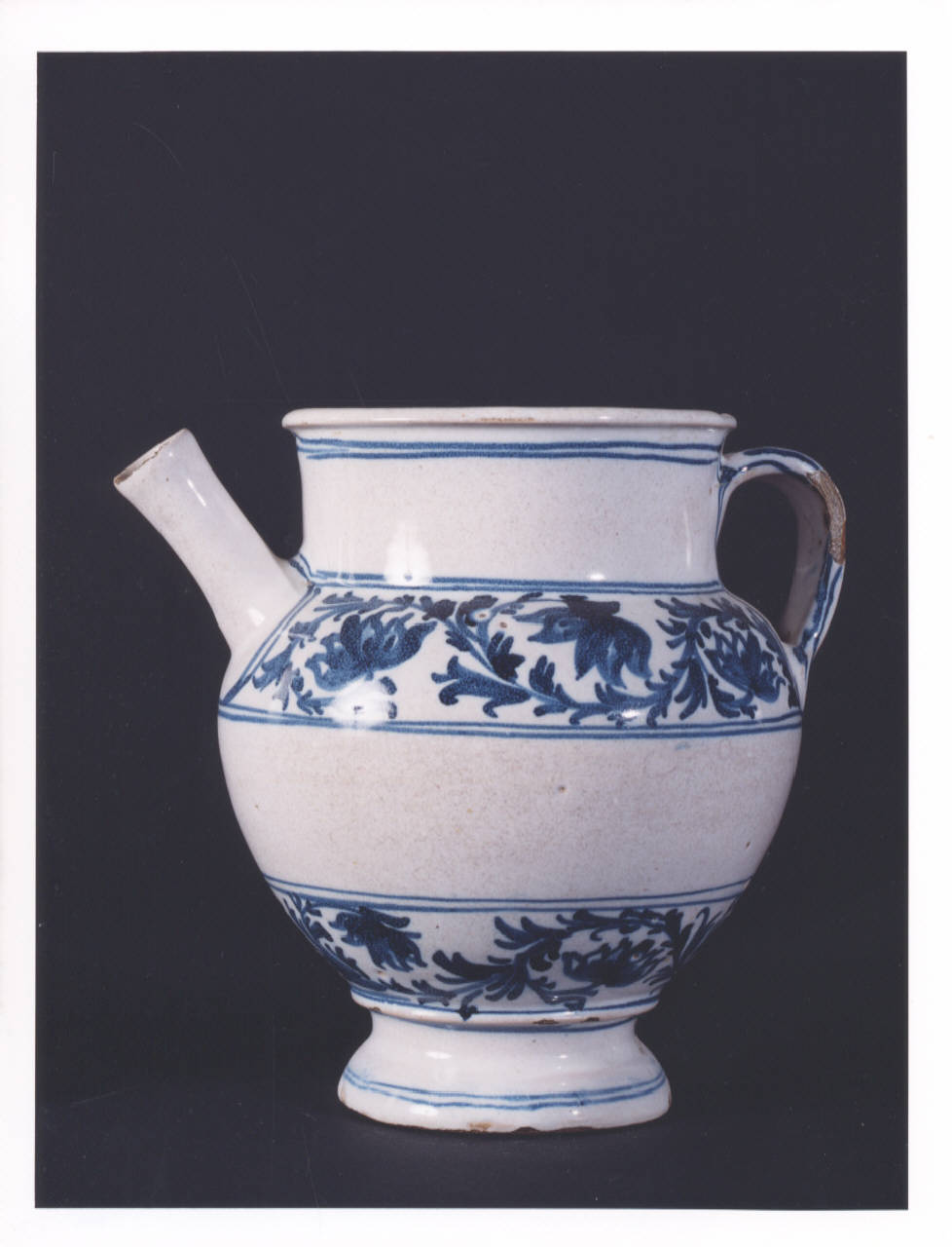 Vaso con corpo ovoidale su piede espanso, collo cilindrico terminante con bocca ad orlo estroflesso, ansa piatta, versatoio a cannello cilindrico. Decorazione a motivi floreali in monocromia turchina su fondo bianco. Nella zona mediana la decorazione è interrotta da un cartiglio delimitato da doppia filettatura privo di iscrizione
