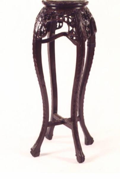 Supporto in legno a quattro gambe curve raccordate da traversa a X, decorate a motivi floreali e a foglioline, fianale a forma di artiglio di rapace in atto di stringere una sfera