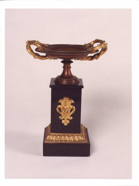 Coppetta da parata di forma ovoidale con largo collo estroflesso profilato a fitte scanalature verticali, due manici a doppia corda intrecciata terminanti a guisa di tralcio fiorito, piede circolare gradinato; sostegno in marmo nero con struttura a parallalepipedo, centrato da uno stemma in bronzo dorato, base quadrata sormonata da una decorazione a foglioline in bronzo dorato