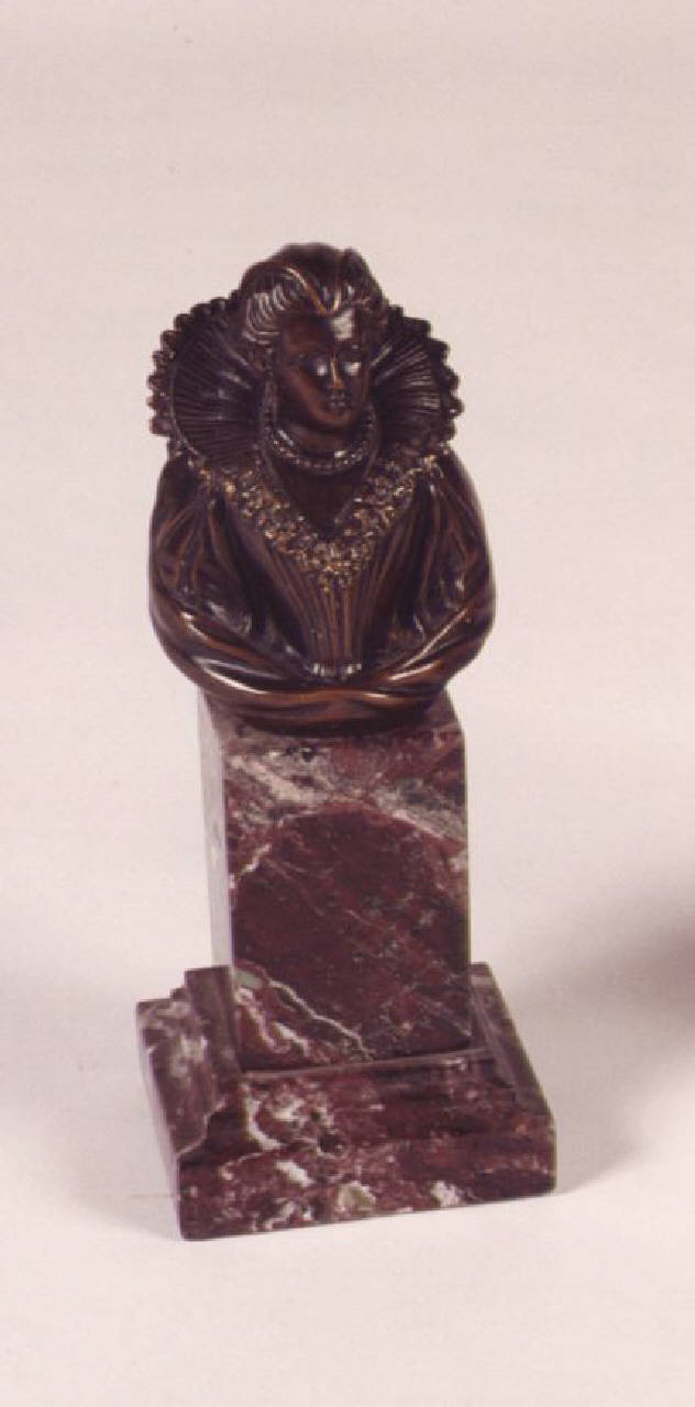 Busto raffigurante una dama elegantemente vestita su sostegno a parallalepipedo con base gradinata